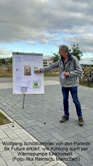 Der Unternehmer wies dabei auf einen weiteren Vorteil der kalten Nahwärme hin: Gebäude können bei entsprechender Planung im Sommer ökologisch und sehr sparsam passiv gekühlt werden. Die Wärmepumpe entzieht den Räumen dabei überschüssige Wärme, die ins Erdreich zurückgeführt wird. Kalte Nahwärme ist damit doppelt effizient: Sie sorgt für behagliche Wärme im Winter und angenehme Kühlung im Sommer. Dies funktioniert u.a. auch über eine Wärmepumpe, die insbesondere für kleinere Hauseinheiten und Wohnungen eine erprobte Alternative zu den Nahwärmenetzen darstellt, wie Wolfgang Schöllhammer von den P4F Mainz den Teilnehmenden in einem Kurzvortrag veranschaulichte. Weitere Infos im Handout „Kühlen mit Wärmepumpe“.