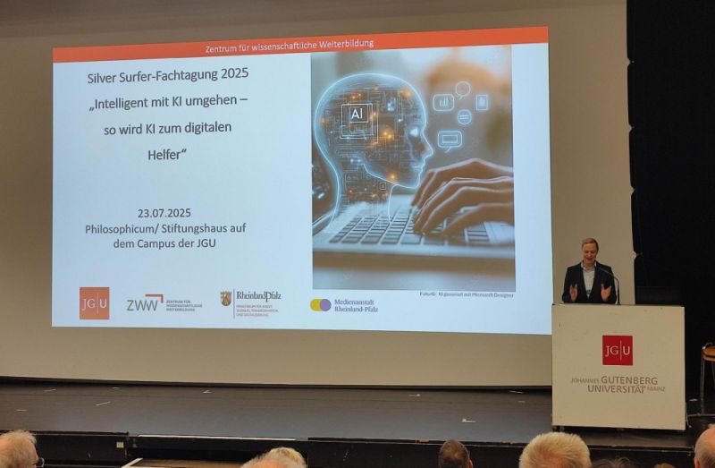 Am 23. Juli 2025 trafen sich auf dem Campus der Johannes Gutenberg-Universität Mainz über 130 engagierte Ehrenamtliche aus PC- und Internettreffs sowie Digital-Botschafter:innen aus Rheinland- Pfalz zur diesjährigen Silver Surfer Fachtagung, die erstmals im Zeichen der künstlichen Intelligenz (KI) unter dem Motto „Intelligent mit KI umgehen – so wird KI zum digitalen Helfer“ stand. Viele Mitglieder, von Neustadt im Netz, die selbst Digitalbotschafter RLP sind, waren vor Ort vertreten, um einen Eindruck über zukünftige Themen zu erhalten und sich mit anderen auszutauschen und zu vernetzten.