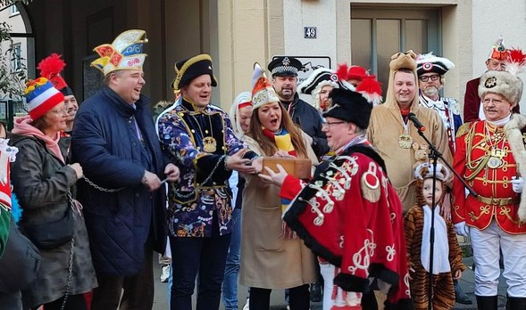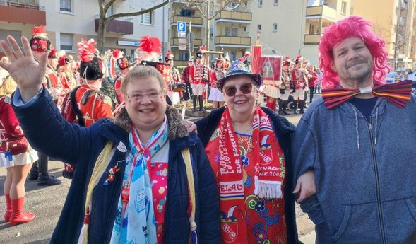 Martin Goldenbaum, Carola Schilling und Helga Ahrens (v.l.) nahmen am 3. Februar 2024 als Vertreter:innen der Vereins Neustadt im Netz e.V. an der närrischen Erstürmung der Ortsverwaltung Mainz-Neustadt in der Leibnizstraße teil.