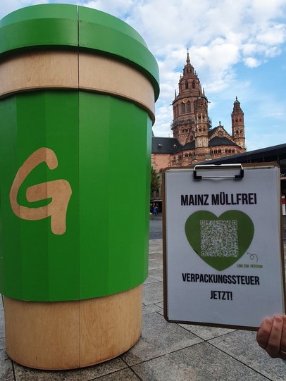 Die Greenpeace Ortsgruppe Mainz-Wiesbaden lehnt die Verzögerung in der Debatte um die Einführung einer kommunalen Verpackungssteuer in Mainz ab. Deswegen sammelte die Gruppe am 30.09. von 15 bis 18 Uhr auf dem Gutenbergplatz mit einem riesigen Mehrwegbecher Unterschriften für die Verpackungssteuer.