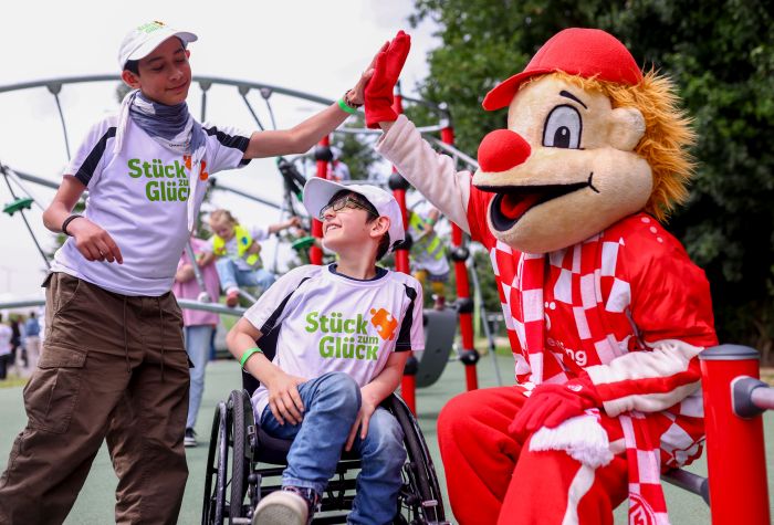 Rund 80 Prozent der Spielplätze in Deutschland sind nicht inklusiv und schließen somit Kinder mit Behinderung aus. Der erste „Stück zum Glück“-Spielplatz in Mainz hingegen bietet Kindern mit und ohne Behinderung die Möglichkeit, zusammen zu spielen und Spaß zu haben. Dieser „Fair Play“-Gedanke verbindet „Stück zum Glück“ mit dem FSV Mainz 05. In Mainz können Kinder nun nicht nur auf dem Platz und im Stadion, sondern auch beim Spielen und Toben auf dem Spielplatz direkt daneben spielerisch erleben, was Fair Play bedeutet. Stefan Hofmann, Vereins- und Vorstandsvorsitzender FSV Mainz 05, bestätigt: „Der Gedanke Fair Play ist auch im Sport und gerade im Fußball von großer Bedeutung. Im Stadion entstehen Begegnungen und wachsen Freundschaften. Kinder mit und ohne Behinderung und deren Familien können sich spielend und unvoreingenommen begegnen – das ist bei uns in der Fußballarena so, aber auch hier auf dem Spielplatz.“ Der neue inklusive Spielplatz in Mainz sorgt so für mehr Gleichberechtigung und Teilhabe. Bei der Gestaltung des Spielplatzes wurde zudem besonderer Wert auf die ganzheitliche Förderung der Kinder gelegt: Die vielseitigen Spielgeräte fördern gezielt ihre kognitive, motorische, koordinative und soziale Entwicklung.