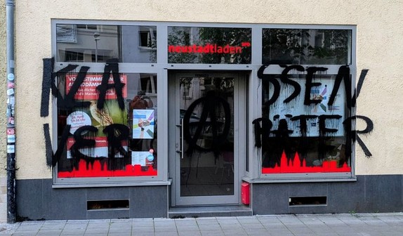 Der SPD-Neustadtladen am Lessingplatz mitten in der Mainzer Neustadt wurde in der Nacht vom 29. auf den 30. April 2025 großflächig mit dem Schriftzug "Klassenverräter" besprüht und verschmutzt. Die schwarze, schwer lösliche Farbe prangt auf der Fensterfront, der Eingangstür bis zu den Hausmauern.