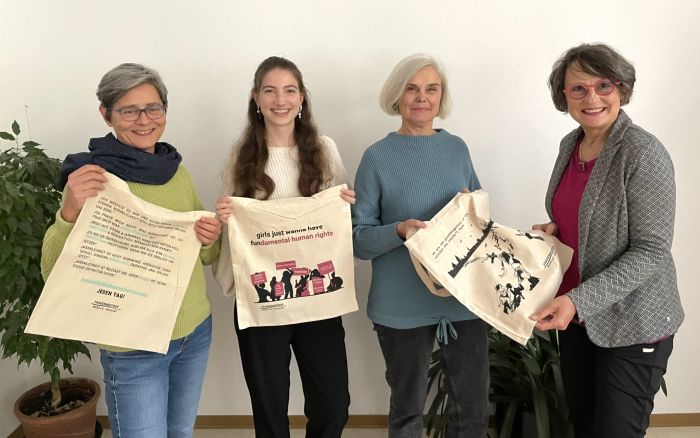 Anette Diehl (rechts im Bild), die letztes Jahr ihr 35. Jubiläum der Mitarbeit bei der Fachstelle zum Thema Sexualisierte Gewalt begehen konnte, positioniert sich mit den diesjährigen Jubiläums-Kolleginnen und den neuen Stofftaschen. Diese bilden die langjährige Entwicklung der Frauennotrufarbeit ab: Von einem Veranstaltungsmotiv aus den Anfangsjahren der Notrufarbeit bis hin zur Erweiterung der Unterstützungsarbeit für Mädchen und der Öffnung für betroffene Männer. „Die überreichten Taschen haben natürlich nur einen symbolischen Charakter für die langjährige und mehrgenerative Mitarbeit unserer Kolleginnen, denen wir damit danken möchten“, so Anette Diehl.